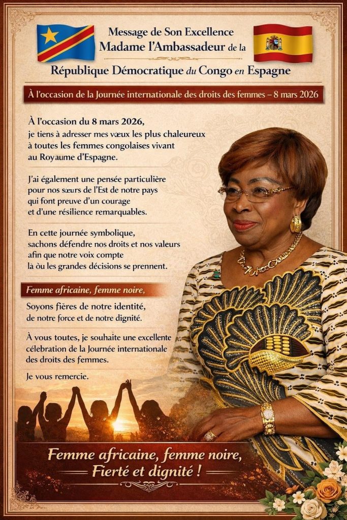 Con motivo de la jornada del 8 de marzo de 2026, dedicada a los derechos de la mujer, deseo expresar mis más cálidos saludos a todas las mujeres congoleñas que viven en el Reino de España.